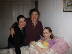 Here’s a picture from afterwards–Louise is on the right with the assistant midwife Sarah on the left.  Bella is the one in the Winnie the Pooh hat.